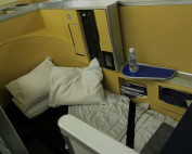 寝るときのフルフラットは文句なしです。悪く言う人はカプセルホテルだと言う人もいましたが、飛行機の中では文句ありません。寝るときにはCAさんに伝えると、CAさんがベッドメークをしてくれます。下にカバーを入れて、毛布を引いて、枕も睡眠用の物を準備してくれます。そして止めはアロマの香りによるリラックスシートを準備してくれます。他の香りは無いので、必要なときは自分で持ち込みましょう!これってある意味ホテルのターンダウンですよね。