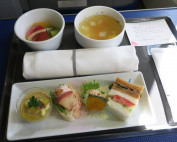 食事は飲み物と同時に運んできてくれます。国際線用のようにアミューズから始まってではないのでしたね。前に並べられた箱は少し味気ない物ですが、開けると煌びやかな内容です。日本食らしい少ない量を品数多く頂く構成です。これだけ食べてもカロリーが544kcalなのは嬉しいです。飛行機での食事は多くの場合にすることが無いので、食べ過ぎ高カロリーとなるので海外キャリアの場合には注意しています。