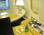 さて時間になったので搭乗口に行きます。思っていたのとは逆の搭乗口が開いたので少し吃驚しました。搭乗はバスで乗り込みます。最初のバスにのると後ろ側の入口から搭乗です。問題なく搭乗終了です。来るときと同じプライベートスイート(オールド)でのんびりと出発を待ちます。例によって待っている間に、少し椅子を傾けておきます。機材の説明は前回の記事を参考にして下さい。