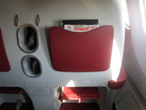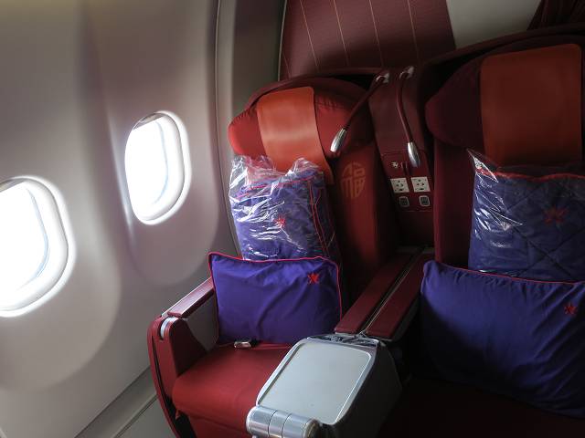 入るとビジネスクラスのボードが立てられており暫く待ちます。なんだかんだで一番で機内に入る事になります。機内に入ると赤い色の造りが目を引きます。なんとなくドラゴン航空を思い出しますね・・