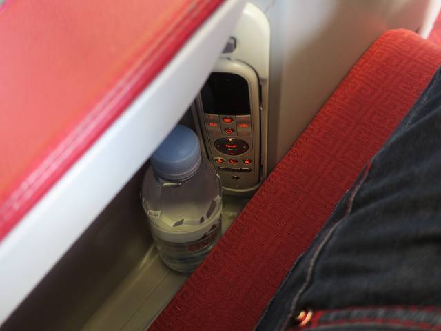 座席の前にはディスプレイが最初は無いかと思いましたが横に収納するタイプでした。逆に目の前は少しスッキリしています。しかし座席周りの布が破れていたりとあまり綺麗にメンテナンスされているとは思えない状況です。まあ仕方なしです。