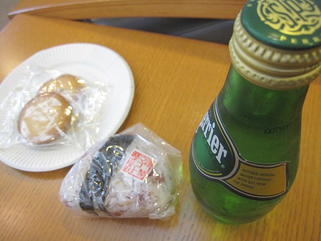 少し時間があるのでラウンジで時間を過ごします。おなじみの構成ですが、朝早く移動して少しお腹が減ったのでラウンジを見渡すし御握りとペリエを発見したので有難く頂きます。デザインや心遣いについては何も言いません・・