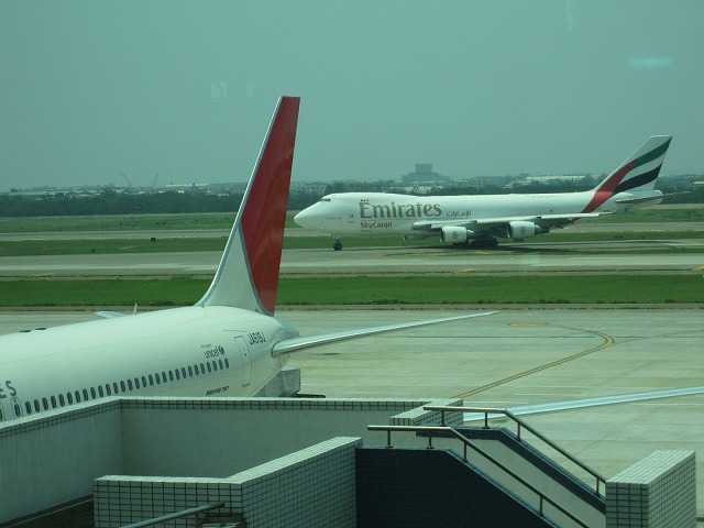 そんなこんなで搭乗です。機材は767-300です。この機材はかなりの回数搭乗しましたが何時見ても綺麗に整っていると感じます。飛行機としては747-400が飛行機だなーと感じますが767-300はコンパクトに整っていると感じますね!とか勝手に思っていると後ろをエミレーツのカーゴが通過します。今年一押しの航空会社なので反応してしまいました!