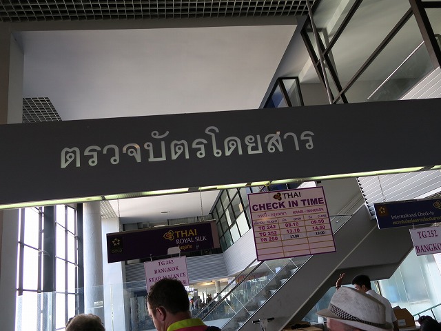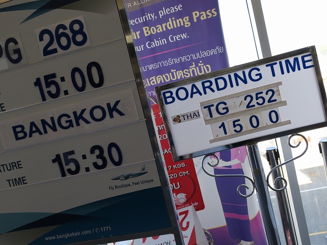 時間になったのでゲートに向かいます。少し遅れて飛行機が到着し直ぐに搭乗になりますが・・・此処から大混乱になります。バンコクエアウェイズと同じゲートでスタッフも誤ったアナウンスを開始します。アナウンスが国内ゲートと国際ゲートと同じで大混に陥ります。挙句の果てにTGとPGを呼び間違えて英語で判断している人とタイ語で動く人が逆のゲートに並ぶことになりました。しかしコレで間違え無く搭乗できる乗客はは凄かったです!