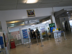 搭乗の約1時間前である14時にクラビ空港に到着します。ターミナル1の入口を入ると直ぐに航空会社のカウンターが並んでいます。便数が少ないようで電光掲示板ではなく便名と時間がプレートに直接書き込まれているスタイルです。そして取って付けたような看板に哀愁が漂います。