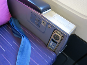 何時ものレトロなタイ国際航空の座席です。慣れていると言えば慣れています。座席は電動では動きませんがリクライニングとフットレストはある程度動きます。座席後別にディスプレが付いておりVODのコントローラもあります。