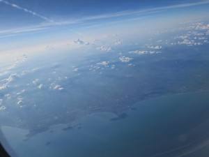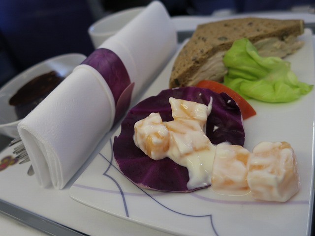 離陸してクラビの島を眼下にバンコクに向かいます。そして機内食のチキンサンドイッチ やはり不味く・・少しだけ頂いて終了です。