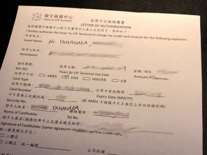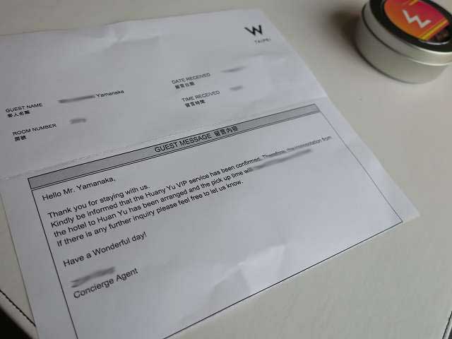 予約はオンラインでも可能なのですが、送迎の車の運転手名等と面倒な事を書く必要があったのでW台北のコンシェルジュから依頼を掛けます。車の情報や私の情報もまとまっているので通常の車の手配の手続きにパスポートの情報を提供するだけで完了です。2時間後にはW台北のコンシェルジュチームから完了の連絡が入ります。