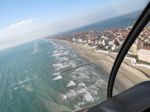 最初にリド島を北から南に移動します。この島は外洋にさらされているので上から見ても波が強く当たっているのが良く分かります。右手側を見るとヴェニスの町が見えますが、こちらは次のお楽しみです。