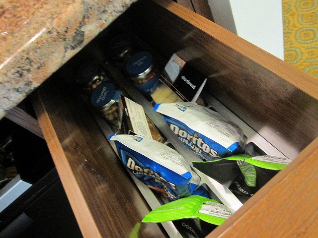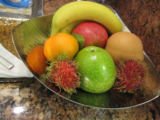 入り口近くには冷蔵庫とスナック類が準備されています。もちろん無料のフルーツもサービスで付いてきました。今回は更に無料でチョコレートも付いていましたが普段から付いているものなんでしょうか?
