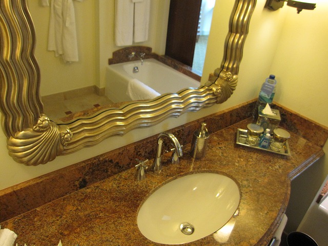 一人で宿泊しているので意味が無いのですがダブルシンクではありません。シンクの周りは金色で豪華な雰囲気を出そうとしているのは分かるのですが、このような部分で何か残念な気がします。