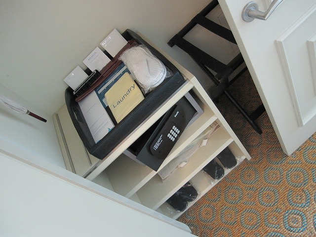 リビングに通過する通路には冷蔵庫とクローゼットがあります。広さはもちろん問題ありません。セキュリティボックスも同じ場所に設定されています。またリゾートホテルらしくビーチサンダルやバスケットが準備されていました!
