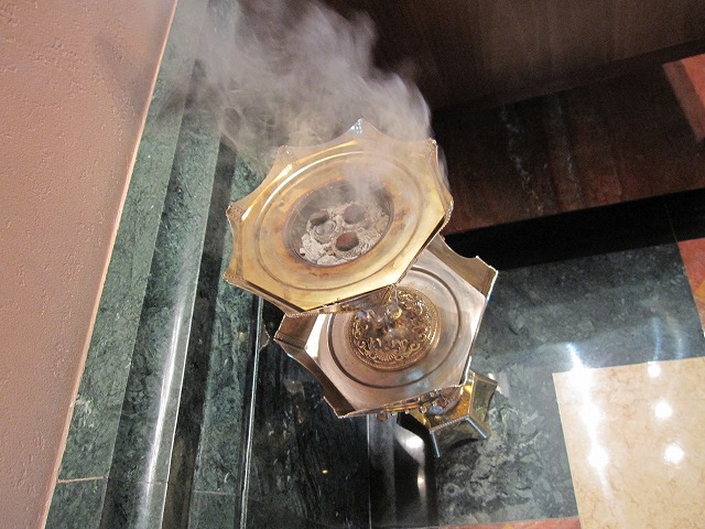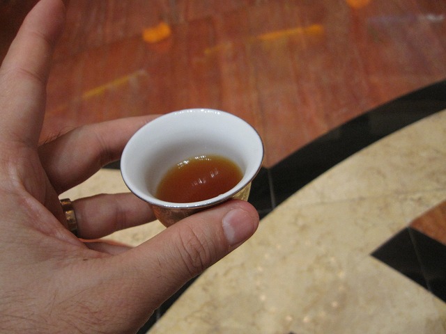 レセプションでは良い香りを演出するためにお香の様なものを焚いたスタッフが歩いていました。で・・中東と言えばデーツとアラビックコーヒもWelcomeの意味で頂きました。正式な手順に則ってデーツとアラビックコーヒを同時に頂いて、二杯目をおかわりです!