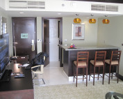 目に入ってくるのは大型の机とソファーです。7人程度は座れる規模の大きさでした。目を引くのは電灯のデザインですね。もちろん薄型のテレビやミニバーも完備されています。気になったのは机が無い事です。ちょっと仕事で処理をしたい時に場所が無かったのでこれは是非に改善して欲しいと思いました。
