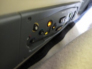 かなりの人が乗っていました。友人も一緒に韓国に移動ですので久しぶりのトークを楽しみます。今回の機材は相当に年季の入った747-400です。ディスプレイも小さく座席のコントロールも懐かしい物です。