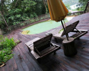構成としては入口のダイニングルーム、外にあるリビングルーム、更に下に降りるとデッキ、デッキに隣接してプールです。リビングまでは屋根がありますが壁は無いに等しいのでほとんど外に居るのと同じことです。左に入って行くとバスルームそして初めて壁に囲まれたベッドルームです。言葉で書くと普通の部屋ですが、写真を見てください!違いが判ると思います。