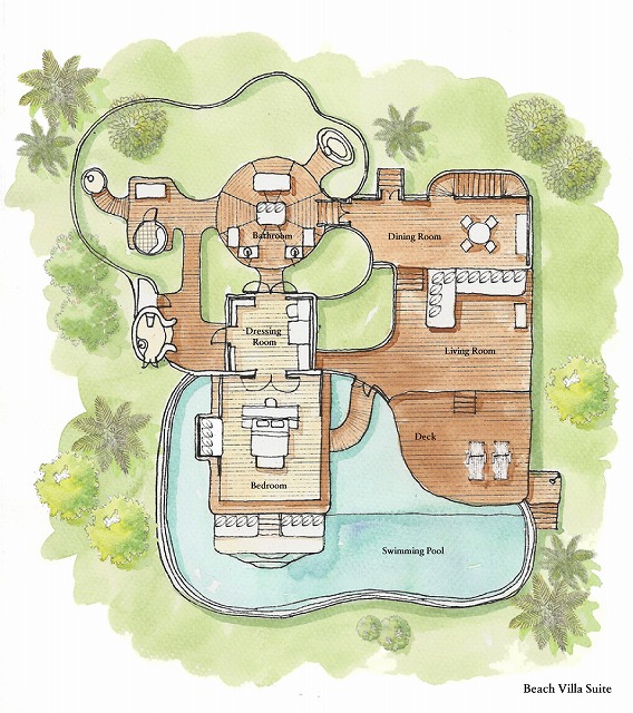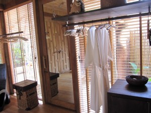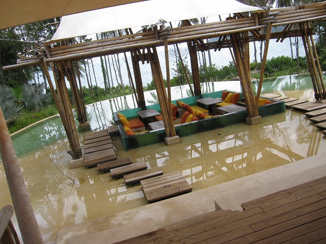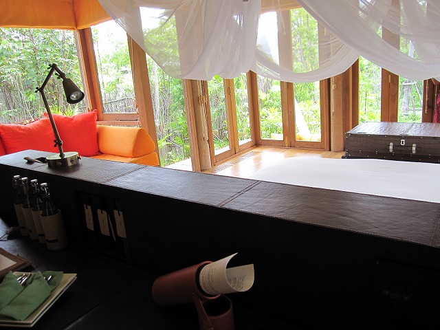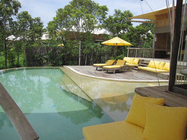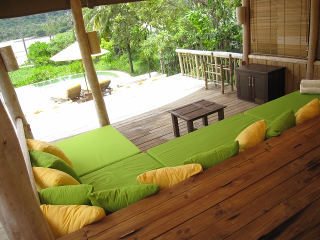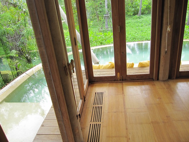 構成としては入口のダイニングルーム、外にあるリビングルーム、更に下に降りるとデッキ、デッキに隣接してプールです。リビングまでは屋根がありますが壁は無いに等しいのでほとんど外に居るのと同じことです。左に入って行くとバスルームそして初めて壁に囲まれたベッドルームです。言葉で書くと普通の部屋ですが、写真を見てください!違いが判ると思います。