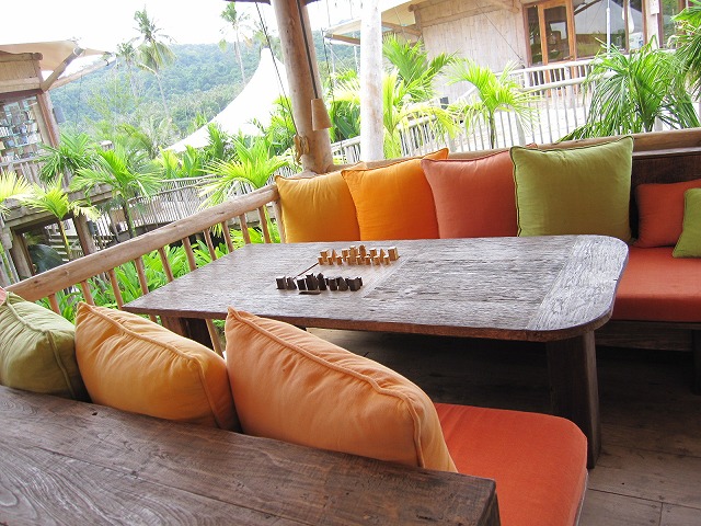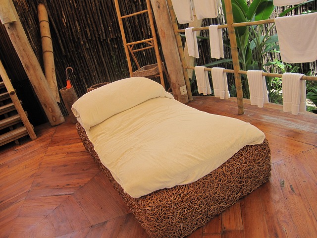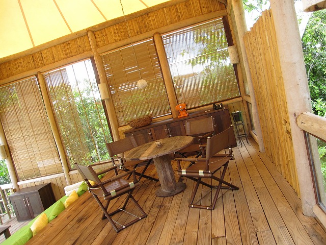 ダイニングを一段下りた場所がリビングです。ここには8名以上が座れるようなソファーが準備されています。一応カーテンのような仕切りも可能ですがここはほとんど外です。夜中少し時間をここで楽しんでいたら蚊に相当さされたので早めにベッドルームに避難しました。