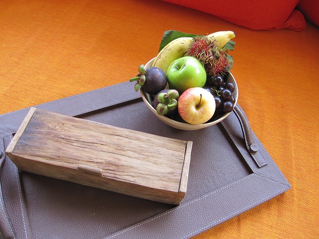 既にソネバキリ空港で私を担当する日本人スタッフと合流しているのでまったく問題なく事が運びます。港を出てお出迎えの竹の入り口を通過すればそこがホテルの共通設備が集まった場所になります。ここのバーでジュースを頂きながらのチェックインになります。そして注意が必要なのはソネバお得意のソネバタイム!です。タイの標準時間より更に一時間早くなるのです。昼間の時間を十分に使うための方法だと思いますが私は大混乱です(笑)