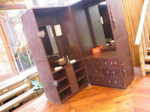 ここからようやく部屋になります。ほかの場所はプライベートではりますがオープンスペースですね・・こちらには化粧台やハンガーなども準備されています。ハンガーの数なども十分であり長期滞在を考えられていますね。