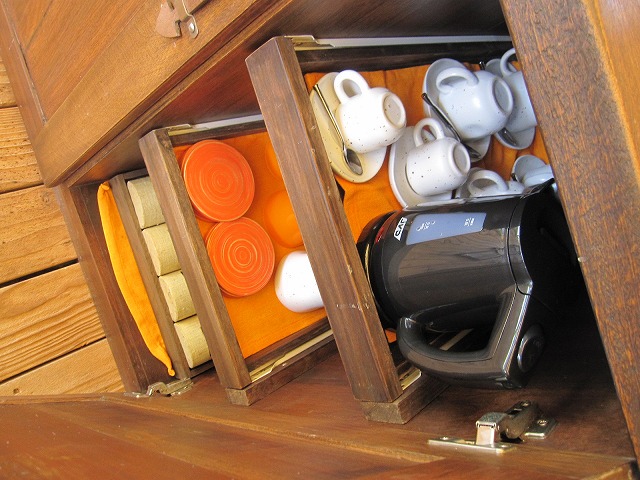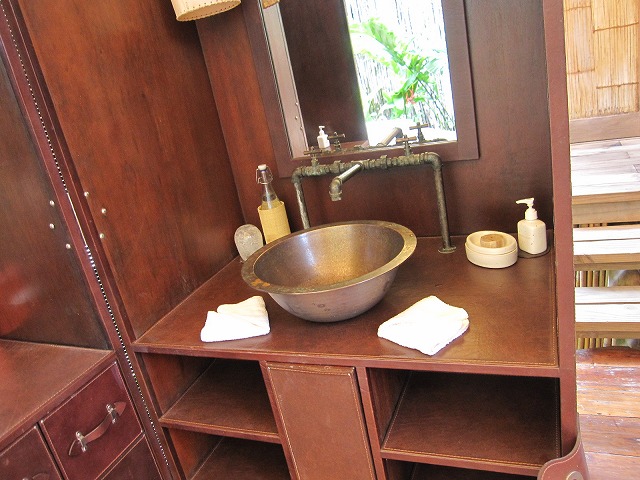 シンクももちろんダブルです。しかし・・・これをダブル シンクと言っていいのか不明です。大きなトランクケースをイメージしたような作りです。引き出しには電燈コントロールやスピーカーのボリュームなども入っています。最後までどのスイッチが何なのかは分かりませんでしたが・・・
