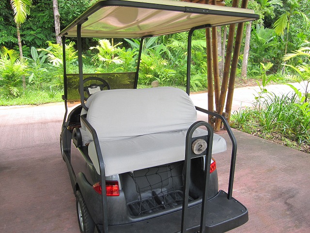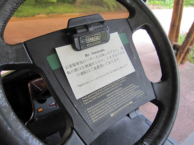 チェックインが終了すると部屋まで移動です。既に裸足なのですが自分の部屋専用のカートが準備されています。しかも自分で運転して構いません。補足事項は日本語で車のハンドルについています!これでホテルの敷地の一番端まで行く事が可能です。これは便利!良く見ると車には部屋と同じ番号が振られています。