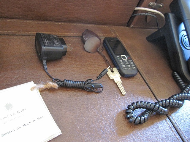 これだけでも一つの部屋として機能しそうな内容です。入ると机があり色々とおいてあります。先ずは携帯ですが、持ち歩いて困ったときにはこれで呼び出せばOKです。私の場合には日本人のGROが真夜中でも対応してくれました。これは楽です。
