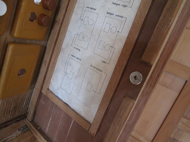天井にはファンが組んでありのんびりとした雰囲気を醸し出してくれます。全ての場所にファンがあるのは少し懐かしい感じがあります。そして最も面倒だったのが電燈・AC・ファンのコントロールです。寝室側にもスイッチ類があるのですが壁に埋め込まれているので分からなくなります。私は夜中にACのスイッチがどこにあるのか一時間ほど探し、最後は諦めてスタッフにヘルプを求めました(泣)。最初の説明で言われていたのですが部屋が大きくスイッチも一杯なので忘れていました。