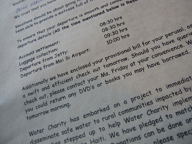 部屋では色々と説明してくれますが多すぎて覚えれません。最後に出発日の予定をちゃんと紙でくれたのは嬉しい心使いです。怒涛のように説明されるので記憶できません。