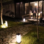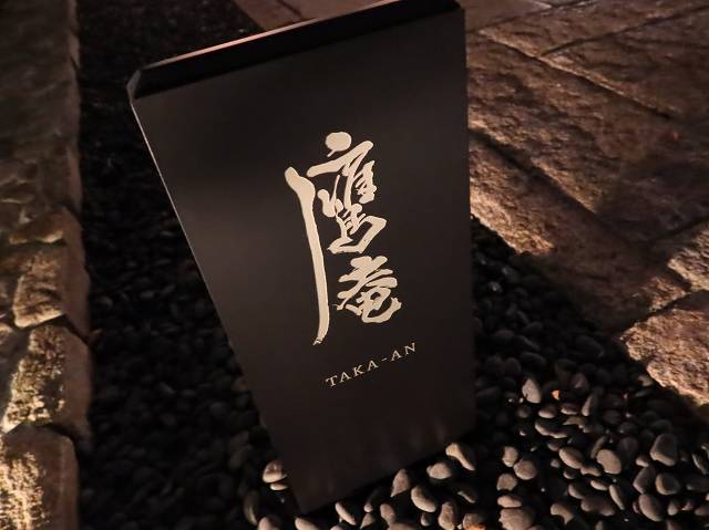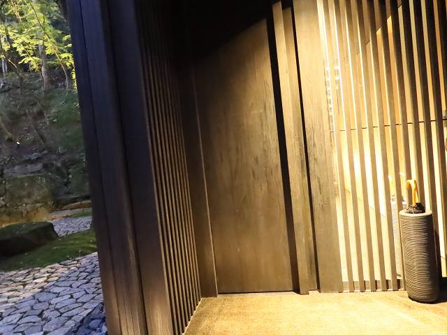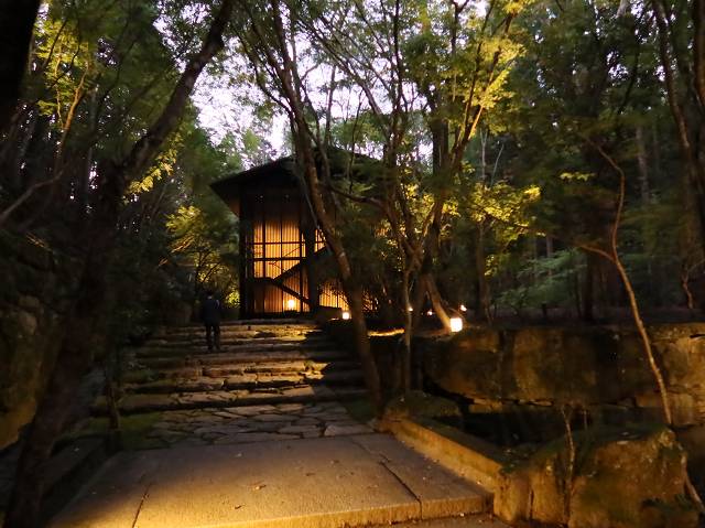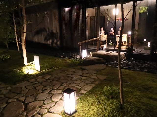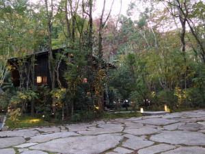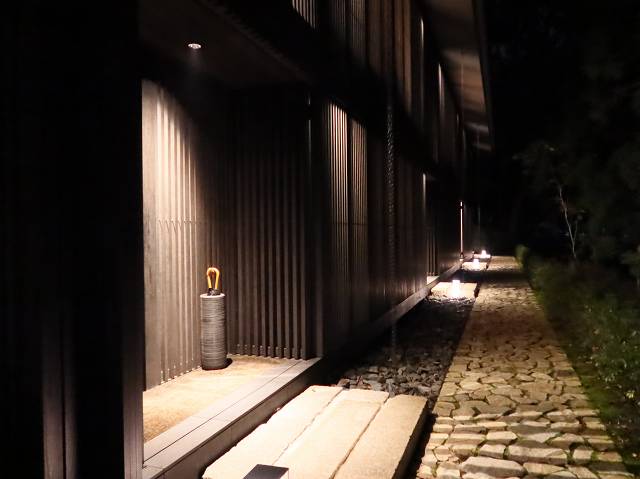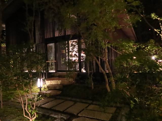 暗くなった敷地をあるき玄関を出た場所にある鷹庵に向かいます。暗闇に浮かぶこのレストラン・・痺れます。
