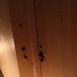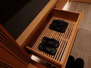 ウエットエリアは玄関とクローゼットの奥から入る二通りの方法があります。クローゼットの奥から入ると、スーツケースを置く場所があります。下の棚には黒い雪駄とセキュリティボックスですね。この雪駄・・どこかで見たような(笑)