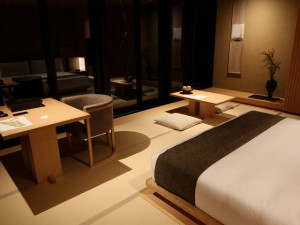 今回お願いしているホテルの部屋は敷地の中でも一番奥にあります。スタッフの方に丁寧に部屋を説明頂きます。畳のリビング兼ベッドルームと同じぐらいの広さを持つウエットエリアの構成です。