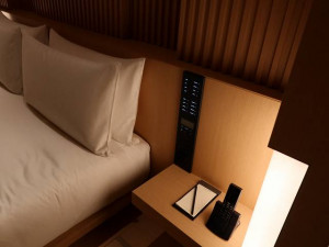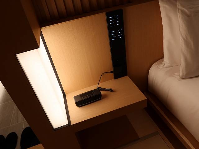 部屋に入ると大きなベッドが凛と佇んでいます。体を包み込むような寝心地ですがマットレスに腰はシッカリとあります。ベッドの上の壁は開ける事ができ、ウエットエリア側が見えるようになります。ベッドサイドには電話機、メモ帳、水そしてBOSEの外付けスピーカーが準備されています。電話機は番号を入れるのではなく選択式なので簡単に使えます。そしてコントローラが綺麗に収納されています。電灯、シェードそしてエアコンのコントローラが内蔵されています。