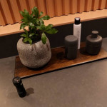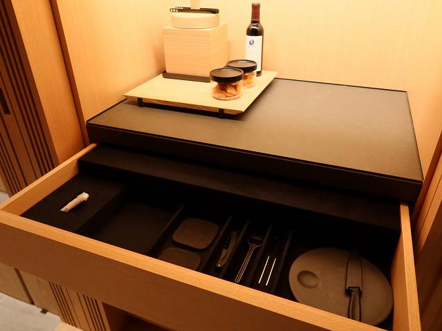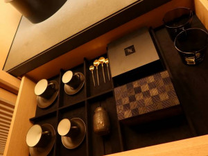 逆の扉を開けるとエスプレッソマシーンとケトルが置いてあります。引き出しを開けるとカップ類が準備されています。その一つ一つが洗練されています。他の場所に置いてあると嫌みな金色の物もアマンのデザインと共にあると溶け込んで嫌みが無くなります。この総合的なセンスが私は好きです。