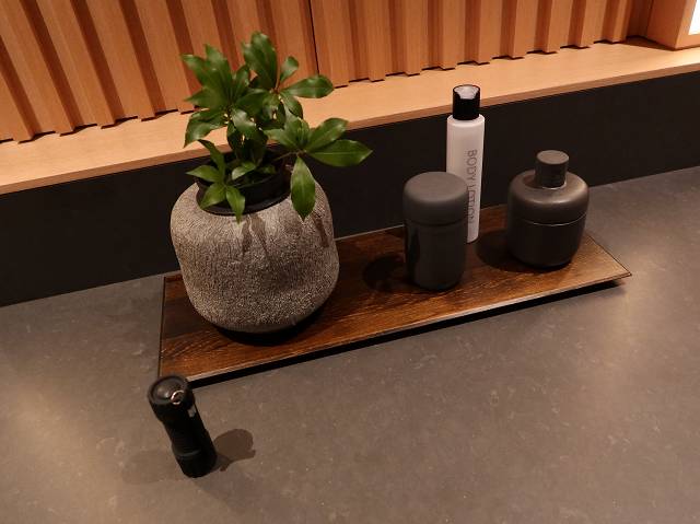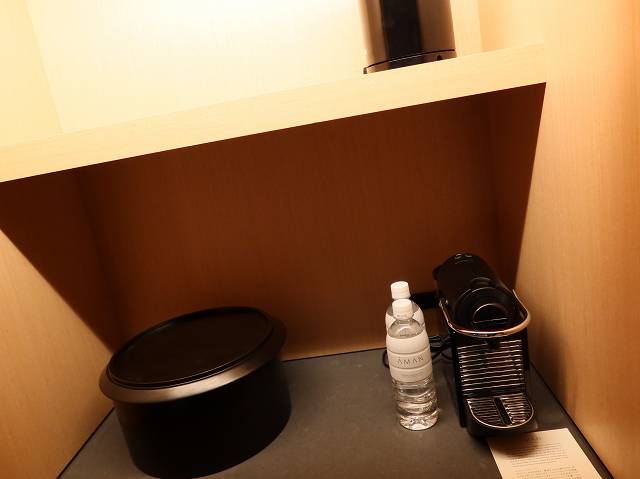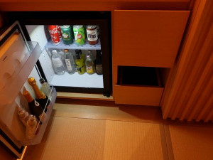 ソフトドリンクはフレッシュフルーツ以外はコンプリメンタリーです。全体的に京都との繋がりを大切にしているようですね。冷蔵庫の隣の丸い穴はゴミ箱だそうです。これは気が付きませんでした。