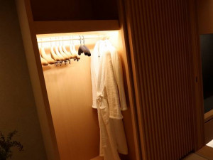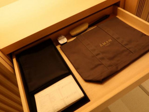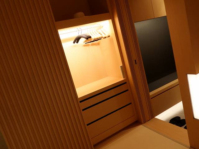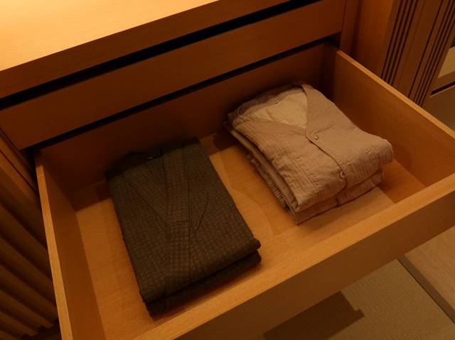 引出を開けるとバッグとラウンドリーの申込書です。このバッグも持って帰って大丈夫だそうです。しっかりしており良いお土産になります。さらに下の段には温かいパジャマもあります。私は浴衣は苦手なのでパジャマが標準であるのは嬉しい限りです。