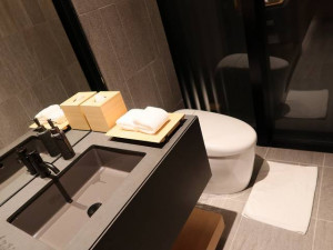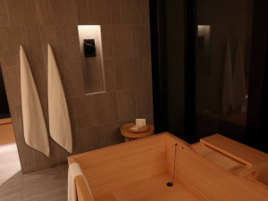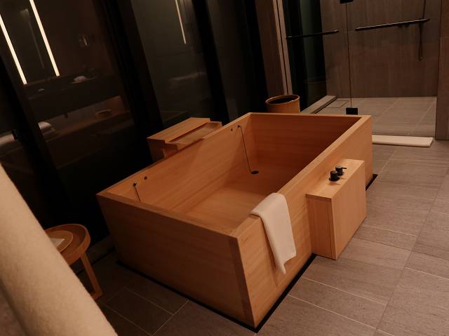 湯船を見ると「大きい!」非常にゆったりとしています。お湯を溜めるには30分ほどかかりますが、温かいお湯を湯船に入れると更に木の香りが広がります。部屋のお風呂は温泉ではありませんが、良い香りに包まれて滞在できました。