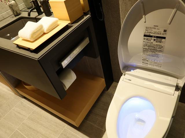 奥の扉を開けるとお手洗いです。こちらには最新のお手洗いがあり勿論ウオッシュレットです。お手洗い専用のシンクもあり至れり尽くせりの準備がされています。なにより木の良い香りが良いですね。