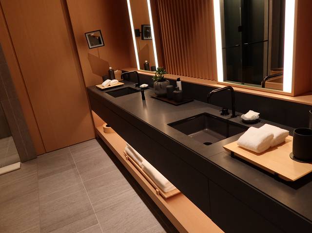 黒いダブルのシンクは機能的です。壁にもバスタオルはあるのですが追加のタオルが更にシンクの下に準備されています。これで不足することは先ずは無いでしょう。