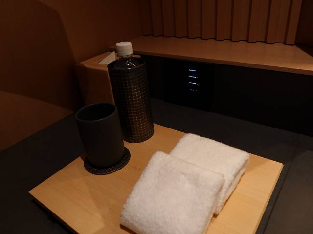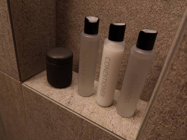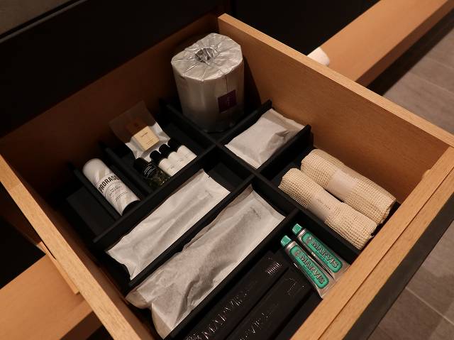 引出を開けるとドライヤー、バスアメニティとLEDランプがあります。外が暗いので夜に移動するときに使用するためだそうです。バスアメニティも充実しています。一品一品の品質も良く歯ブラシもしっかりしていました。自分の歯ブラシも持ってきましたが今回はこちらを使用しました。ライトコントロールも壁に埋め込まれており機能的です。