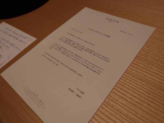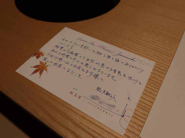 そして手書きの総支配人からのメッセージです。とても丁寧な内容でアマンらしくて良いですね・・よく見るともう一枚案内があり、カクテルレセプションのお誘いです。こちらは後で少し見に行くことにしました。