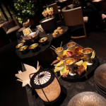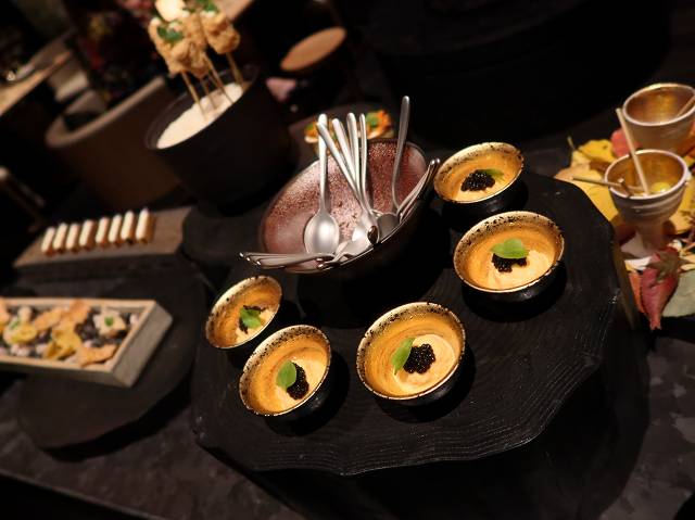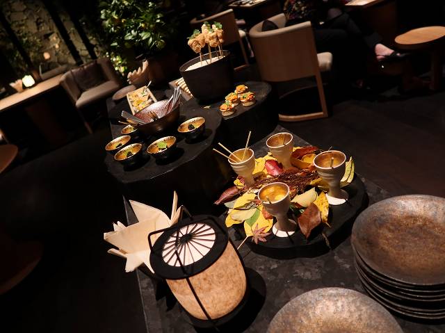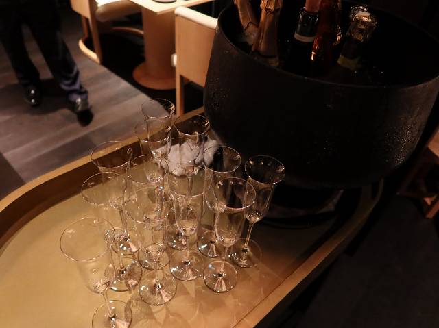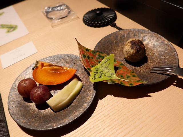 食事の前にカクテルレセプションに少し参加します。ホテルの方と色々と意見を交換しお話を伺います。秋らしい雰囲気の食べ物を頂き話も弾みます。お酒は飲まないのですが軽くシャンパンを頂きました。