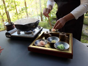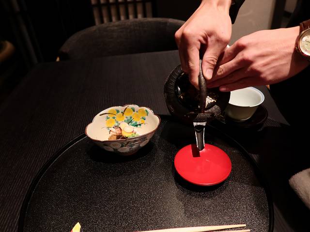 食事中も副料理長が付きっ切りで湯豆腐をよそって頂いたり、京都の食事について話が盛り上がります。