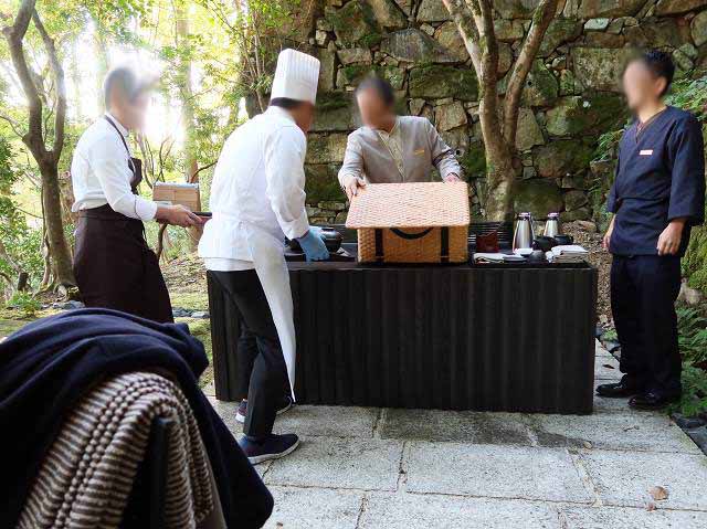 ピクニックと銘打っているのでお弁当のような物を頂くと思っていましたが・・スタッフの方が続々と集まり準備しだします。総勢5名で準備して頂いたのは湯豆腐での朝食です。