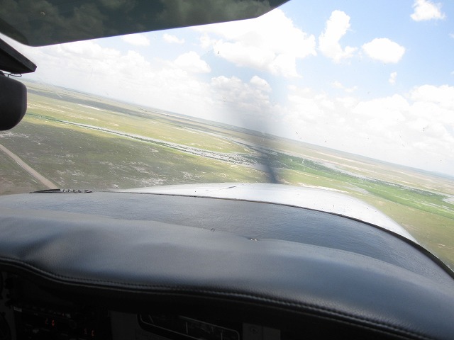先ずは座席の選択ですが勿論私はコパイロットの位置に潜り込みます。良い天気の中、飛行機は快音を響かせて離陸です。もちろんドライバーのサイモンは最後まで手を振っていてくれました。