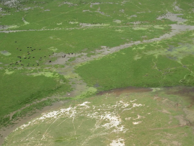 下を見ると緑のアフリカが広がりました。真下にはカバの群れが水を浴びて楽しんでいる様子が良く分かります。