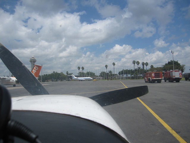 名残惜しいのですがホテルを出て空港に向かいます。空港に到着すると丁度、迎えの飛行機が到着です。飛行場で手続きを行い早速飛行機に搭乗です。あれ・・来た時と機長が違います。そうです今回は非常にまじめなパイロットの青年でした!前の機長は話を聞くとオーナーだったそうです。道理で・・・iPhone・・ですね。