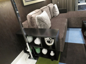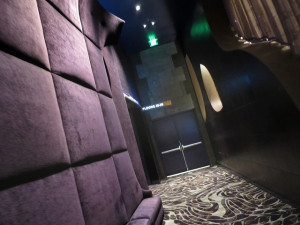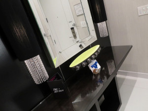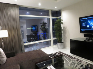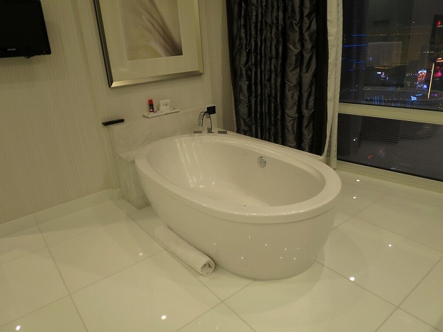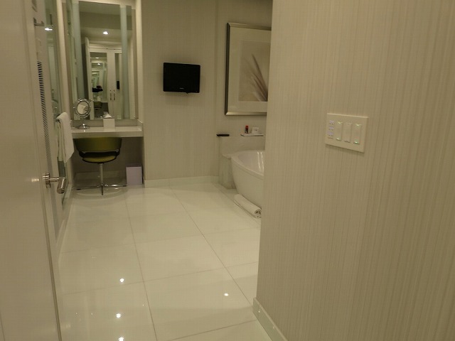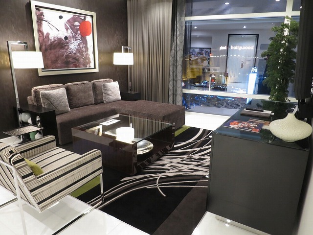扉を開けて中に入ると広々としたリビングとラスベガスの街の灯りが見えます。扉の傍にはマスターのスイッチ類が並んでいます。床は大理石でヒンヤリした造りになっています。また入った直ぐの場所には大きな鏡とよくわからないオブジェが並んでいます。