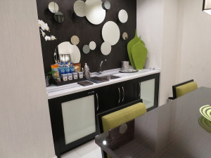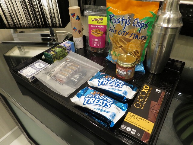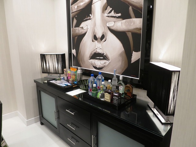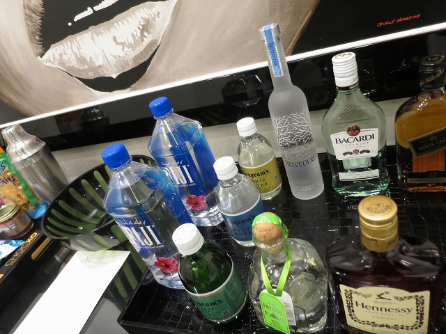 ミニバーにはこれでもかと飲み物やスナックが揃っています。逆側にはシンクもあります。お酒を私は飲みませんがシェイカーまであります。
