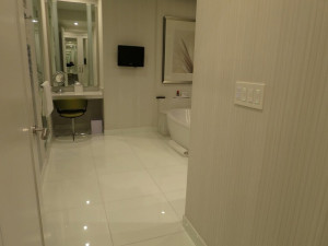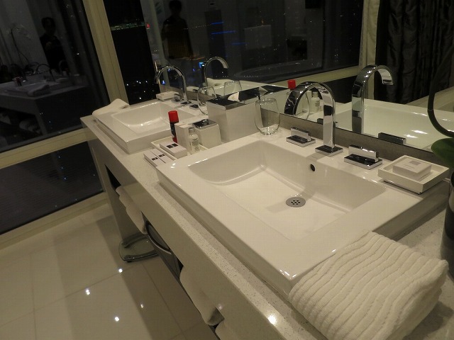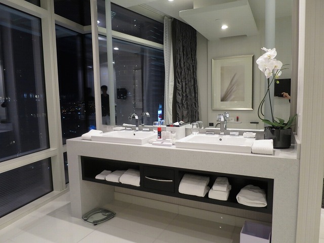 鏡のあるドレッサーも同じエリアに設定されています。バスルームに入ると卵型のバスタブです。しかも外の景色を見ながら入れるスタイルで私の好きなタイプです。アメニティも十分揃えられています。今回は歯ブラシも最初から準備されています。